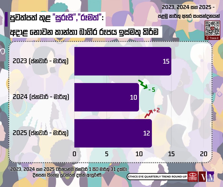 පහත දැක්වෙන්නේ 2023, 2024 සහ 2025 යන වසර වලදී පළමු කාර්තුව තුලදී තෝරාගත් සිංහල භාෂා පුවත්පත් තුළ, පුවතකට අදාළ නොවනා අවස්ථාවන් හිදී “රූමත්” හෝ “සුරූපී” යන යෙදුම් ඔස්සේ කාන්තා බාහිර ස්වරූපය ඉස්මතු කෙරුණු වාර ගණනයි.