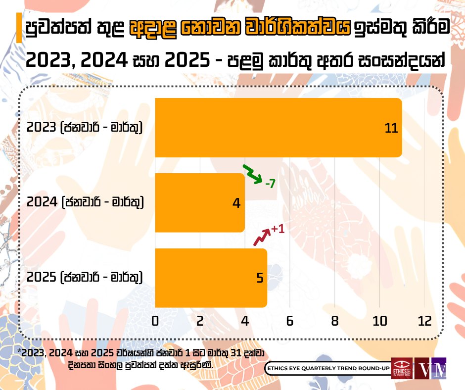එහිදී නිරීක්ෂණය කළ හැකි වන්නේ, 2023 පළමු කාර්තුවට සාපේක්ෂව 2024 වර්ෂයේ පළමු කාර්තුව තුළ මෙම ආචාර ධර්මය කඩවීම හතකින් පමණ අඩු වී ඇති බවයි. එහෙත් 2024 පළමු කාර්තුවට සාපේක්ෂව 2025 වර්ෂයේ පළමු කාර්තුව තුළ මෙම ආචාර ධර්මය කඩවීම එකකින් පමණ වැඩි වී ඇති බව පෙනී යයි.