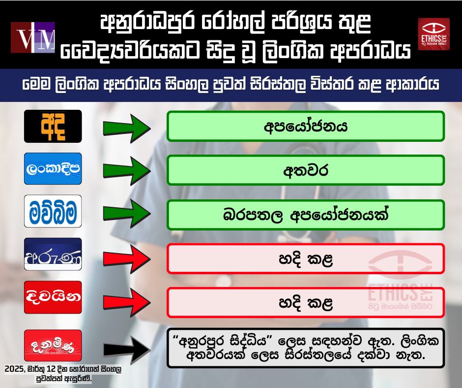 සිංහල පුවත්පත් මුල්පිටු සිරස්තල තුළ එම ලිංගික අපරාධය හැඳින්වීමට භාවිතා කළ යෙදුම් පහත පරිදි දැක්විය හැක.