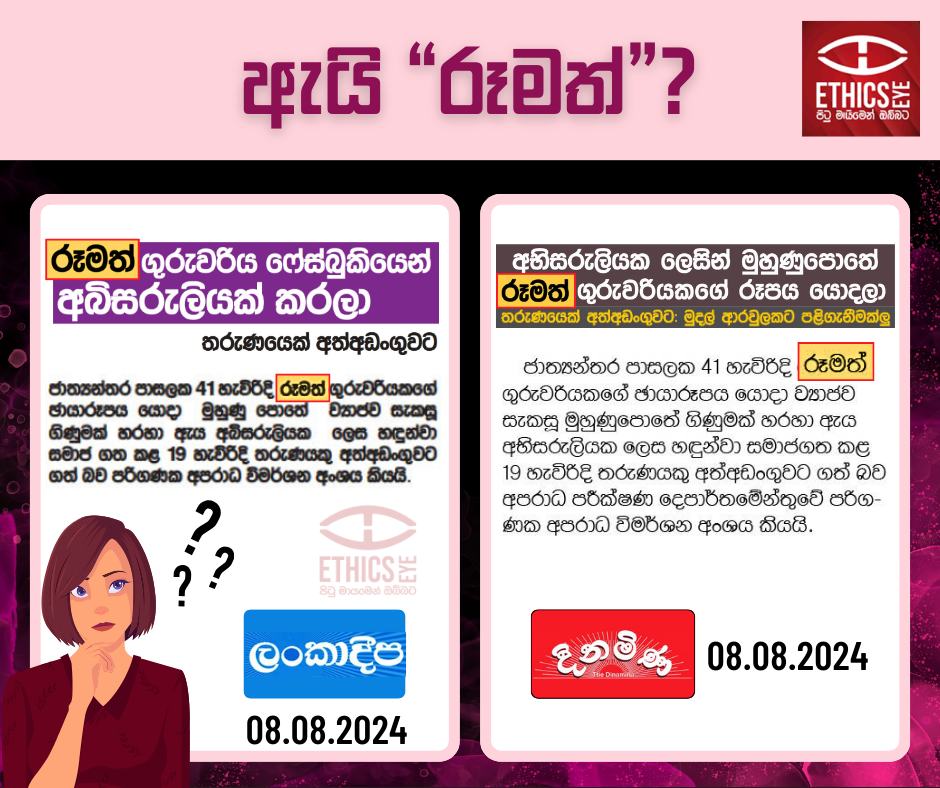 * ලංකාදීප – “රූමත් ගුරුවරිය ෆේස්බුකියෙන් අබිසරුලියක් කරලා” (අන්තර්ගතය තුළද “රූමත්” යැයි සඳහන් වේ).