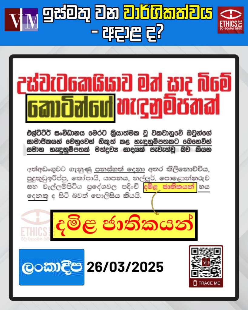 කෙසේ නමුත්, “උස්වැටකෙයියාව මත් සාද බිමේ කොටින්ගේ හැඳුනුම්පතක්” යන සිරස්තලයෙන් යුතු ලංකාදීප (මාර්තු 26, 2025) පුවත තුළ අදාළ පුද්ගලයින් “දමිළ ජාතිකයින්” ලෙසින් දැක්වේ.