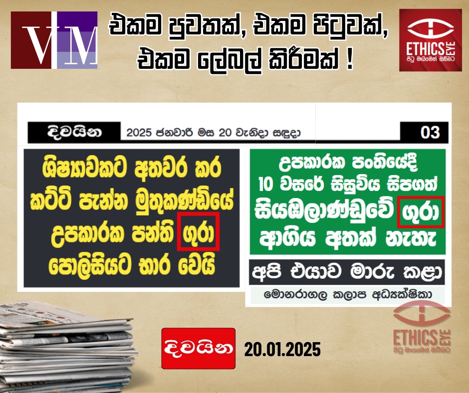 ඒ අනුව, සියඹලාණ්ඩුවේ පාසලක බාලවයස් සිසුවියක ලිංගික අපයෝජනය කළ බවට චෝදනා ලැබූ ගුරුවරයෙකු අත් අඩංගුවට ගැනීමට පොලිස් මෙහෙයුම් ක්රියාත්මක වීම පිළිබඳව, දිවයින පුවත්පතේ (ජන, 20, 2025), එකම පිටුවක, පළවී තිබූ පුවත් වාර්තාවන් දෙකක සිරස්තල යෙදී ඇති ආකාරය පිළිබඳ ඔබේ අදහස කුමක්ද?