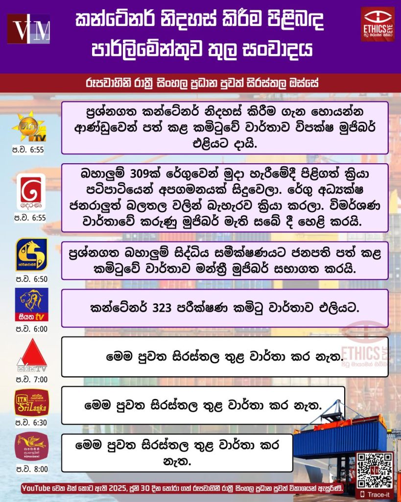 කන්ටේනර් නිදහස් කිරීම පිළිබඳ පාර්ලිමේන්තුව තුල සංවාදය ජූනි 30, 2025 දින රූපවාහිනී රාත්රී සිංහල ප්රධාන පුවත් තුළ වාර්තා කර තිබුණේ පහත අයුරිනි.