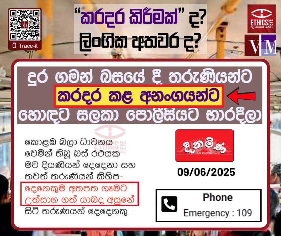නිදසුනක් ලෙසට, නාවලපිටියේ සිට කොළඹ බලා ධාවනය වූ බස් රථයක් තුළදී සිදුවූ බවට පැවසෙන ලිංගික අතවර සිදුවීමක් සම්බන්ධව අයෙකු අත්අඩංගුවට පත් වීමේ පුවතක් දිනමිණ පුවත්පතේ (ජූනි 09, 2025) පහත ආකාරයෙන් සඳහන් වී තිබිණි.