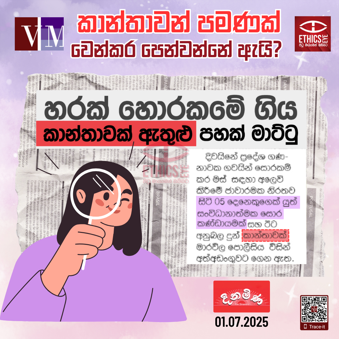 දිනමිණ පුවත්පත තුළ (ජූලි 1, 2025) වාර්තා වූ පුවතක් මෙහිදී නිදසුන් ලෙසින් ගත හැක.