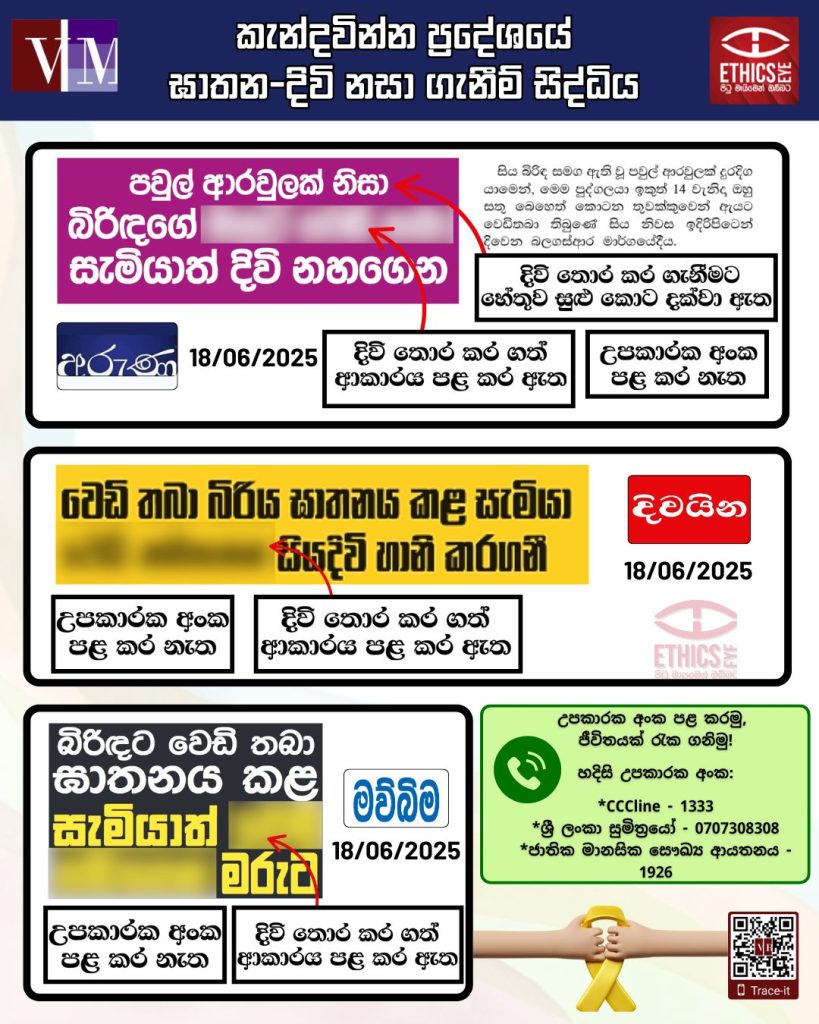 එසේම, දිවි තොර කර ගැනීම පිළිබඳ පුවත් වාර්තාවක් සමගින්, හදිසි උපකාරක අංක සඳහන් කරන මෙන් උපදෙස් දෙන්නේ, එය දිවි තොර කර ගැනීමේ නැඹුරුවක් ඇති අයෙකුගේ ජීවිතයක් ගලවා ගැනීමට උපකාරයක් විය හැකි බැවිනි.