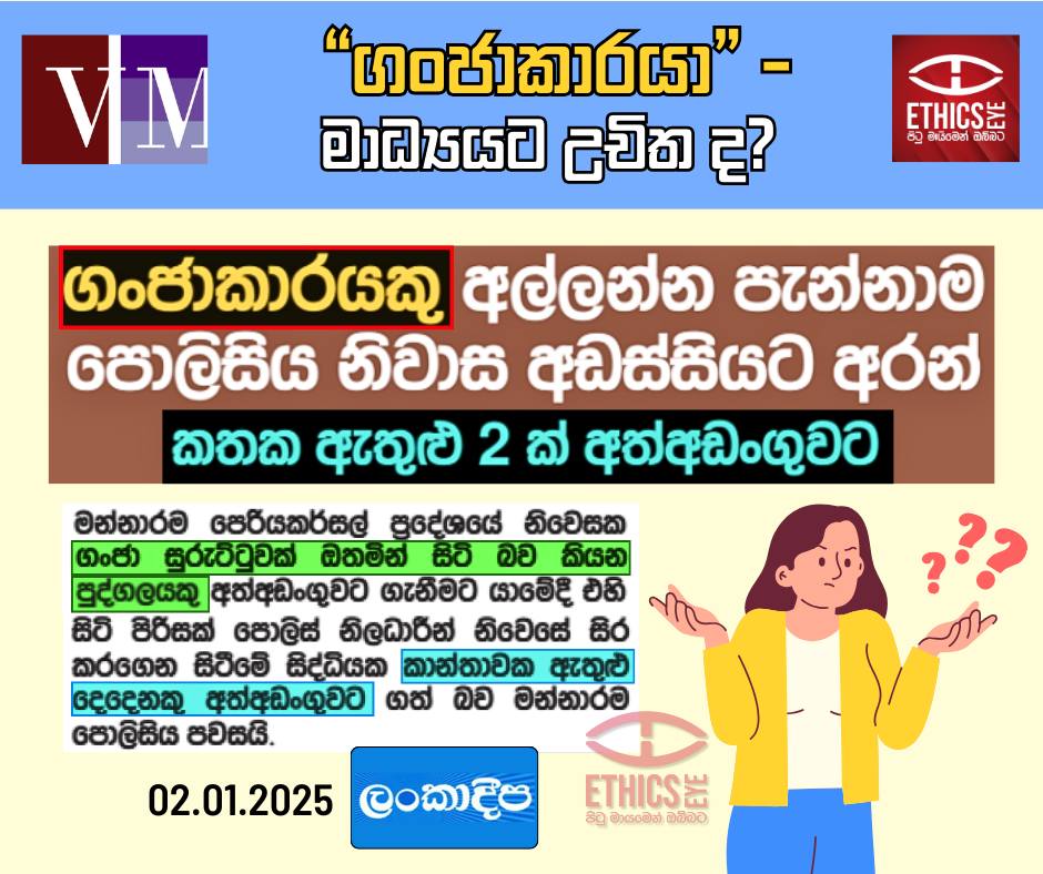 මත්ද්‍රව්‍ය හා සම්බන්ධ අත්අඩංගුවට ගැනීමක් ගැන “ගංජාකාරයකු අල්ලන්න පැන්නාම පොලිසිය නිවාස අඩස්සියට අරන්, කතක් ඇතුළු 2 ක් අත්අඩංගුවට” යන සිරස්තලය යටතේ ලංකාදීප (ජනවාරි 02, 2025) පුවත්පතේ පළ වුණු පුවතකි.