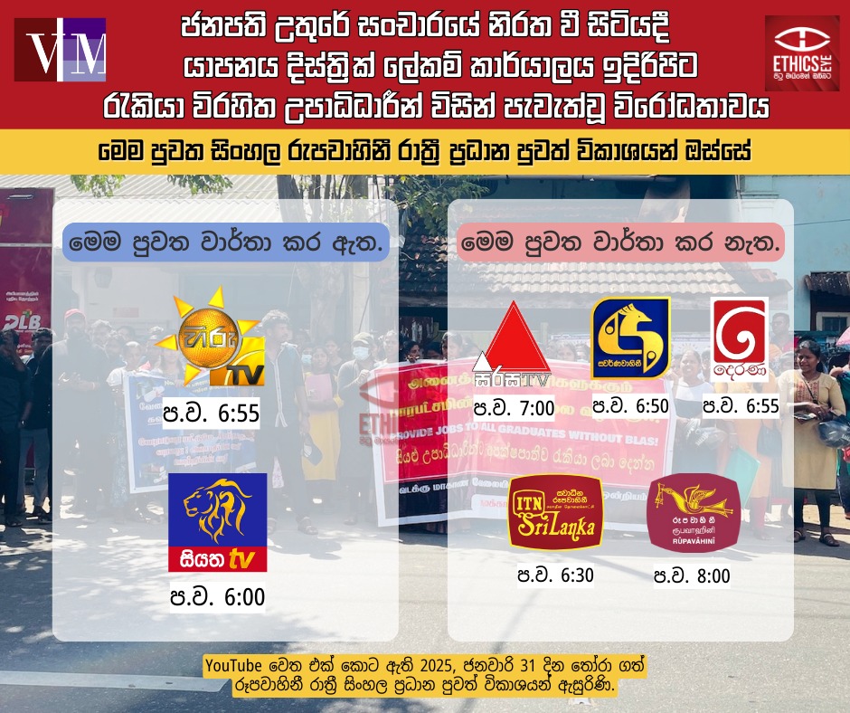 මෙම පුවත, ජන. 31, 2025 දින රූපවාහිනී රාත්රී සිංහල ප්රධාන පුවත් විකාශයන් තුළ, වාර්තා කර තිබූ සහ වාර්තා කර නොතිබූ නාලිකාවන් මෙසේ දැක්විය හැක.
