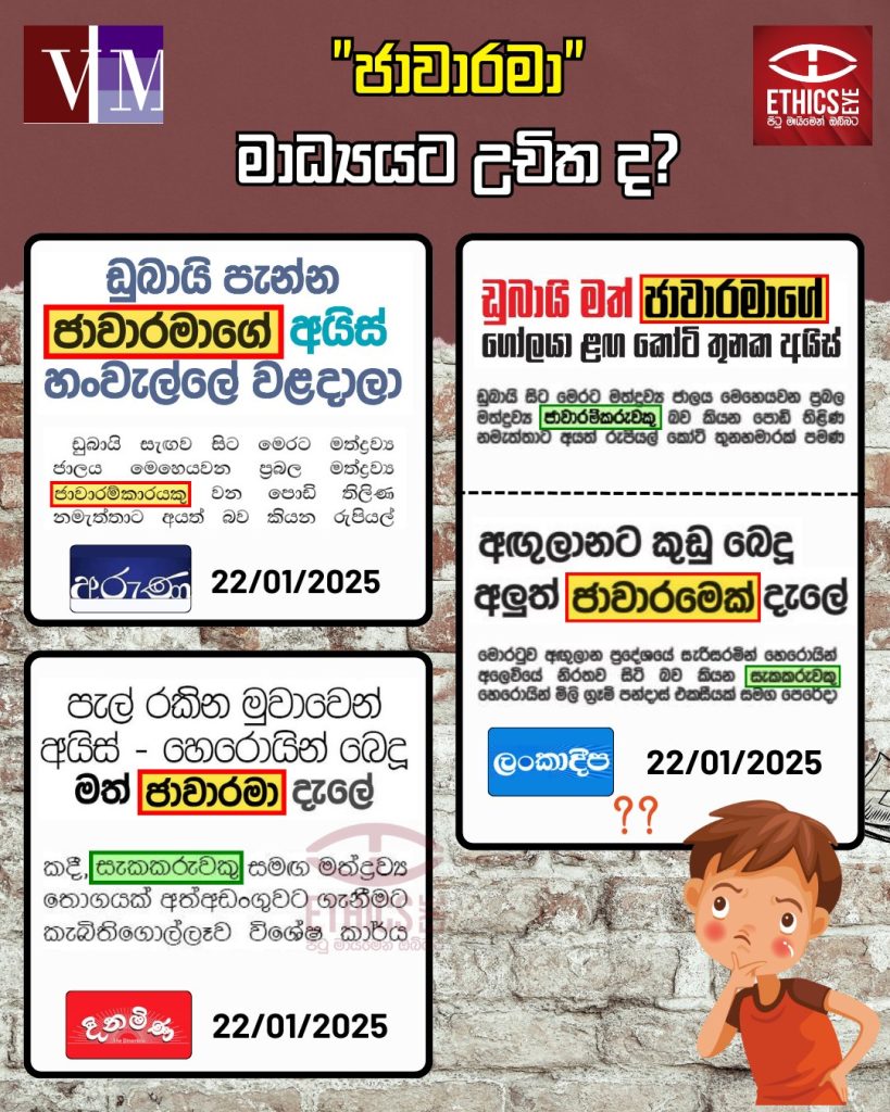 1) බොහෝ විට සිරස්තල තුළම දැක්වෙන “ජාවාරමා”, “ජාවාරම්කාරයා” වැනි යෙදුම් හේතුවෙන්, පූර්ව විනිශ්චයකින් තොරව පුවත ග්රහණය කර ගැනීමට පාඨකයාගේ හැකියාව ගිලිහී නොයන්නේ ද? ඒ වෙනුවට, දිනමිණ සහ ලංකාදීප පුවත් අන්තර්ගතයන් හි සඳහන් වන ආකාරයට “සැකකරුවකු”, “ජාවාරම්කරුවකු” වැනි යෙදුම් වඩාත් උචිත නොවන්නේ ද?