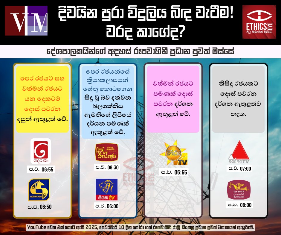 මේ අතර, පෙබ. 10, 2025 දින රූපවාහිනී රාත්රී සිංහල ප්රධාන පුවත් විකාශයන් තුළ, මෙම රට පුරා විදුලිය බිඳවැටීම සම්බන්ධයෙන් වරද ඇත්තේ කොතැනකද, ඒ සඳහා වගකිව යුත්තේ කවුරුන්ද යන්න පිළිබඳව, විවිධ පක්ෂවල දේශපාලනඥයින් දැක්වූ අදහස් ප්රචාරය වී තිබිණි.