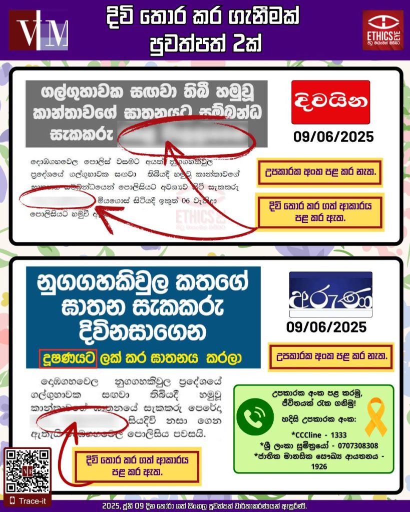 දිවි තොර කර ගැනීම් හෝ ඊට තැත් කිරීම් වාර්තා කිරීමේදී, එවැන්නක් තවත් එක් පුවතක් ලෙසින් නොසලකමින්, ප්රවේසම් සහගතව වාර්තා කළ යුතු බව අපි Ethics Eye තුලින් නිරන්තරයෙන් පෙන්වාදෙන්නෙමු.