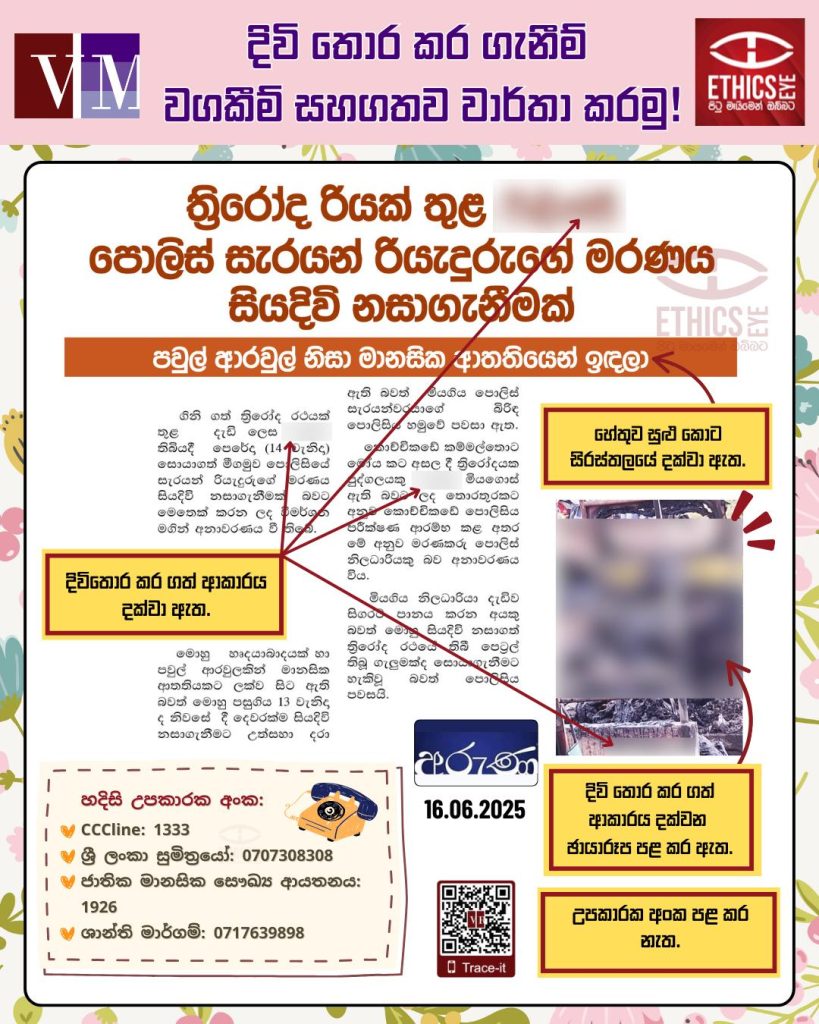 එසේම, දිවි තොර කර ගැනීම පිළිබඳ පුවත් වාර්තාවක් සමගින්, හදිසි උපකාරක අංක සඳහන් කරන මෙන් උපදෙස් දෙන්නේ, එය දිවි තොර කර ගැනීමේ නැඹුරුවක් ඇති අයෙකුගේ ජීවිතයක් ගලවා ගැනීමට උපකාරයක් විය හැකි බැවිනි.