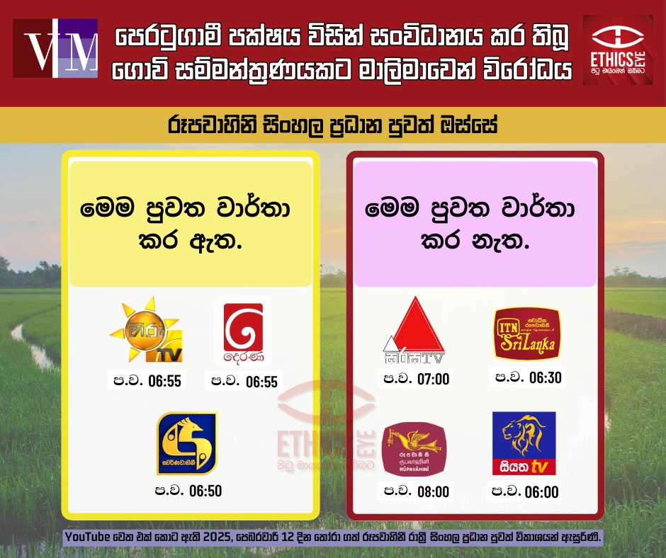 (YouTube වෙත එක්කොට තිබූ, පෙබ. 12, 2025 දින තෝරාගත් රූපවාහිනී රාත්රී ප්රධාන සිංහල පුවත් විකාශයන් ඇසුරිණි.)