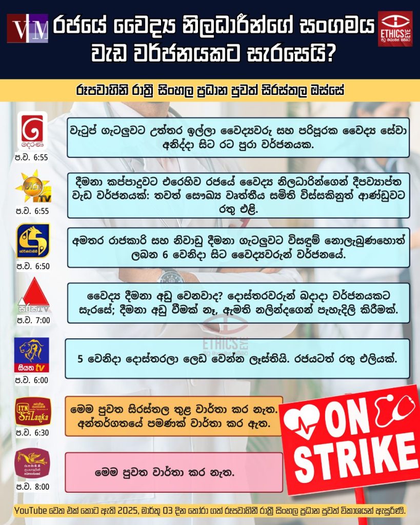 මේ සම්බන්ධයෙන් මාර්තු 03, 2025 දින රූපවාහිනී රාත්‍රී ප්‍රධාන සිංහල පුවත් විකාශයන් හි සිරස්තල තුළ වාර්තා වී තිබූ ආකාරයත්, ඇතැම් පුවත් විකාශයන් තුළ මෙම පුවත වාර්තා වී නොතිබුණ ආකාරයත් පහත අයුරින් දැක්විය හැක.