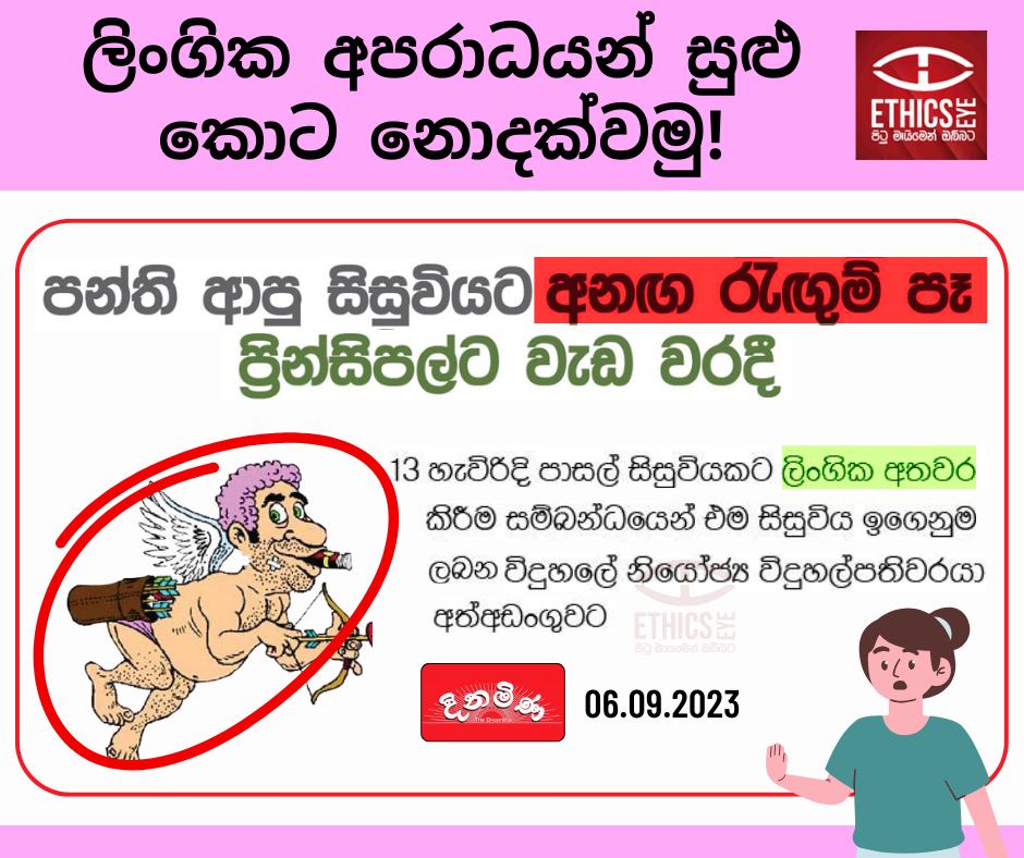 13 හැවිරිදි පාසල් සිසුවියක “ලිංගික අතවරයකට” ලක් කිරීම සම්බන්ධයෙන්, ඇය ඉගෙනුම ලබන විදුහලේම නියෝජ්ය විදුහල්පතිවරයාව අත්අඩංගුවට ගත් සිදුවීම දිනමිණ පුවත්පත (සැප්තැම්බර් 06, 2023) මෙසේ වාර්තා කර තිබිණි.
