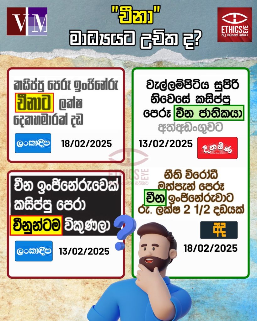 චීන ජාතිකයින් සම්බන්ධ සෘණාත්මක පසුතලයක් ඇති පුවත් වාර්තා තුළ, ඔවුන්ව හැඳින්වීමට “චීනා” සහ “චීනුන්” වැනි යෙදුම් භාවිතා කිරීමෙන් පොදුවේ චීන ජාතිකයන් කෙරෙහි අවමානාත්මක හා කොන් කිරීමේ ආකල්පයක් සමාජය තුළ ජනිත නොවෙන්නේ ද, එසේම එවැනි ආකල්ප ඔස්සේ චීන ජාතිකයින් කෙරෙහි විදේශ භීතිකාවක් පවා ප්රවර්ධනය වීමේ අවදානමක් නොමැත්තේ ද යන ගැටළු, මින් පෙර ද Ethics Eye මගින් පාඨකයන් වෙත ඉදිරිපත් කොට තිබේ.