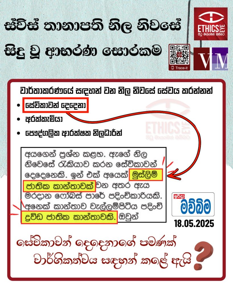 කොල්ලුපිටිය තර්ස්ටන් පාරේ පිහිටි ස්විට්සර්ලන්ත තානාපතිනියගේ නිල නිවසේ රන් භාණ්ඩ සොරකමක්, ඉරිදා මව්බිම පුවත්පතේ වාර්තාවී තිබුණේ පහත අයුරිනි.