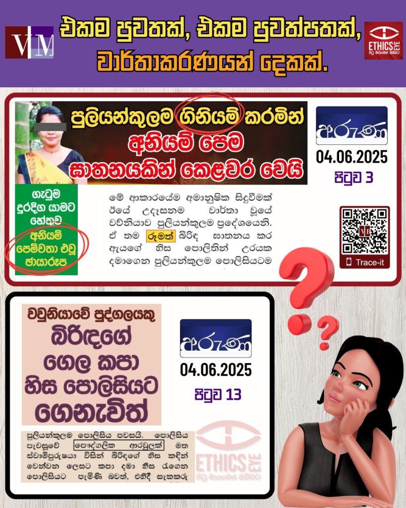 මෙම එකම සිදුවීම සම්බන්ධයෙන්, අරුණ පුවත්පතේ එකම දිනයක (ජුනි 04, 2025) පළ වී තිබුණු පුවත් වාර්තාවන් දෙකක් පහත දක්වා ඇත.