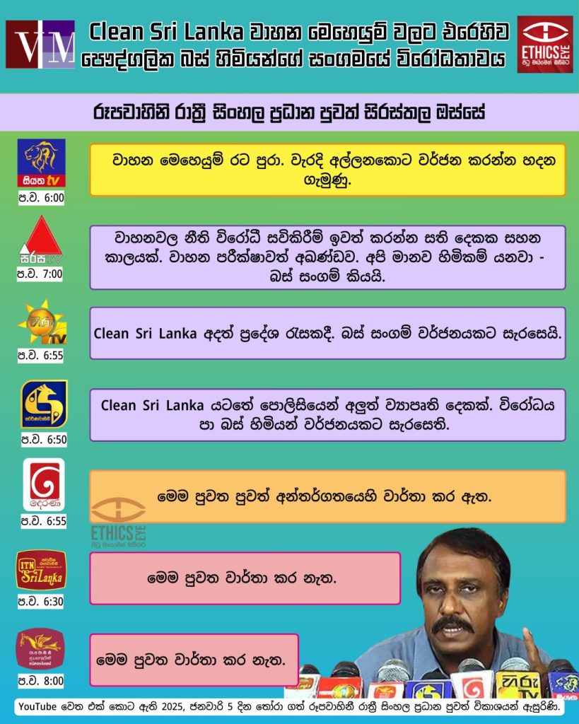 Clean Sri Lanka සමඟින් වාහන වල නීති විරෝධී සවි කිරීම් ඉවත් කිරීම හා අඛණ්ඩව වාහන පරීක්ෂා කිරීමත්, එසේම ඒ සම්බන්ධයෙන් පෞද්ගලික බස් හිමියන්ගේ සංගමය ඇතුළු බස් සංගම් විරෝධය පළ කිරීමත් සම්බන්ධයෙන්, ජනවාරි 05, 2025 දින රූපවාහිනී සිංහල රාත්‍රී ප්‍රධාන පුවත් සිරස්තල තුළ ආවරණය වී තිබුණේ මෙසේයි.
