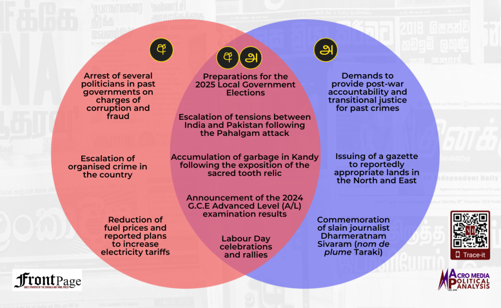 Over the past week the Sinhala and Tamil press converged in relation to five main stories. The five stories were on the: (i) preparations for the 2025 Local Government Elections; (ii) escalation of tensions between India and Pakistan following the Pahalgam attack; (iii) accumulation of garbage in Kandy following the exposition of the sacred tooth relic; (iv) announcement of the 2024 G.C.E Advanced Level (A/L) examination results; and (v) Labour Day celebrations and rallies. The Sinhala press exclusively featured three main stories, and they were on the: (i) arrest of several politicians in past governments on charges of corruption and fraud; (ii) escalation of organised crime in the country; and (iii) reduction of fuel prices and reported plans to increase electricity tariffs. The Tamil press exclusively featured three main stories, and they were on the: (i) demands to provide post-war accountability and transitional justice for past crimes; (ii) issuing of a gazette to reportedly appropriate lands in the North and East; and (iii) commemoration of slain journalist Dharmeratnam Sivaram (nom de plume Taraki).