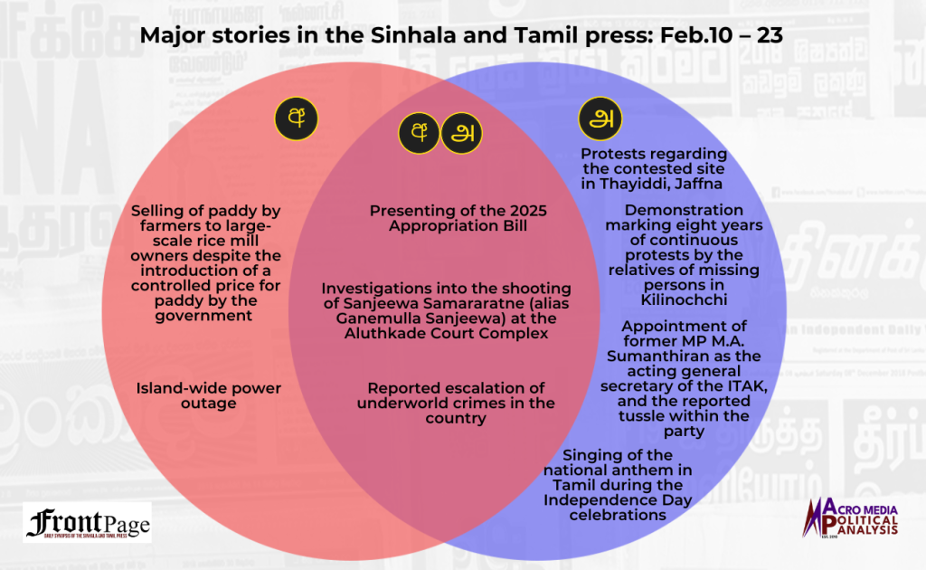 Over the past two weeks, the Sinhala and Tamil press converged in relation to three main stories. The three stories were on the: (i) presenting of the 2025 Appropriation Bill; (ii) investigations into the shooting of Sanjeewa Samararatne (alias Ganemulla Sanjeewa) at the Aluthkade Court Complex; and (iv) reported escalation of underworld crimes in the country. There were two main stories featured exclusively in the Sinhala press. Those were on the: (i) selling of paddy by farmers to large-scale rice mill owners despite the introduction of a controlled price for paddy by the government and (ii) island-wide power outage. The Tamil press exclusively featured four main stories, and they were on the: (i) protests regarding the contested site in Thayiddi, Jaffna; (ii) demonstration marking eight years of continuous protests by the relatives of missing persons in Kilinochchi; (iii) singing of the national anthem in Tamil during the Independence Day celebrations; and (iv) appointment of former MP M.A. Sumanthiran as the acting general secretary of the ITAK, and the reported tussle within the party.