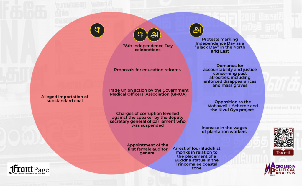 Over the past week the Sinhala and Tamil press converged in relation to five main stories. The five stories were on the: (i) 78th Independence Day celebrations ; (ii) proposals for education reforms ; (iii) trade union action by the Government Medical Officers’ Association (GMOA); (iv) charges of corruption levelled against the speaker by the deputy secretary general of parliament who was suspended; and (v) appointment of the first female auditor general.