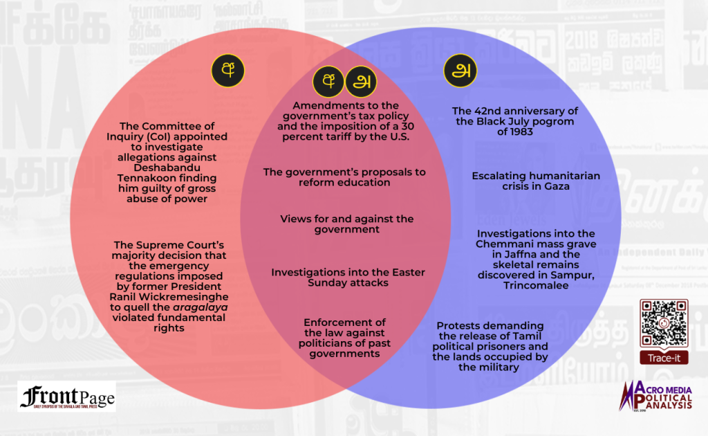 Over the past week the Sinhala and Tamil press converged in relation to five main stories. The five stories were on the: (i) amendments to the government’s tax policy and the imposition of a 30 percent tariff by the U.S.; (ii) government’s proposals to reform education; (iii) views for and against the government; (iv) investigations into the Easter Sunday attacks; and (v) enforcement of the law against politicians of past governments. The Sinhala press exclusively featured two main stories, and they were on the: (i) Committee of Inquiry (CoI) appointed to investigate allegations against Deshabandu Tennakoon finding him guilty of gross abuse of power and (ii) Supreme Court’s majority decision that the emergency regulations imposed by former President Ranil Wickremesinghe to quell the aragalaya violated fundamental rights. The Tamil press exclusively featured four main stories, and they were on the: (i) 42nd anniversary of the Black July pogrom of 1983; (ii) escalating humanitarian crisis in Gaza; (iii) investigations into the Chemmani mass grave in Jaffna and the skeletal remains discovered in Sampur, Trincomalee; and (iv) protests demanding the release of Tamil political prisoners and the lands occupied by the military.