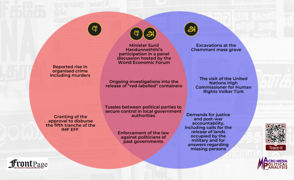 Over the past week, the Sinhala and Tamil press converged in relation to four main stories. The four stories were on: (i) Minister Sunil Handunneththi’s participation in a panel discussion hosted by the World Economic Forum; (ii) the ongoing investigations into the release of “red-labelled” containers; (iii) the tussles between political parties to secure control in local government authorities; and (iv) the enforcement of the law against politicians of past governments. The Sinhala press exclusively featured two main stories, and they were on the: (i) reported rise in organised crime including murders and (ii) granting of the approval to disburse the fifth tranche of the IMF EFF. The Tamil press exclusively featured three main stories, and they were on the: (i) excavations at the Chemmani mass grave; (ii) visit of the United Nations High Commissioner for Human Rights Volker Türk; and (iii) demands for justice and post-war accountability, including calls for the release of lands occupied by the military and for answers regarding missing persons.