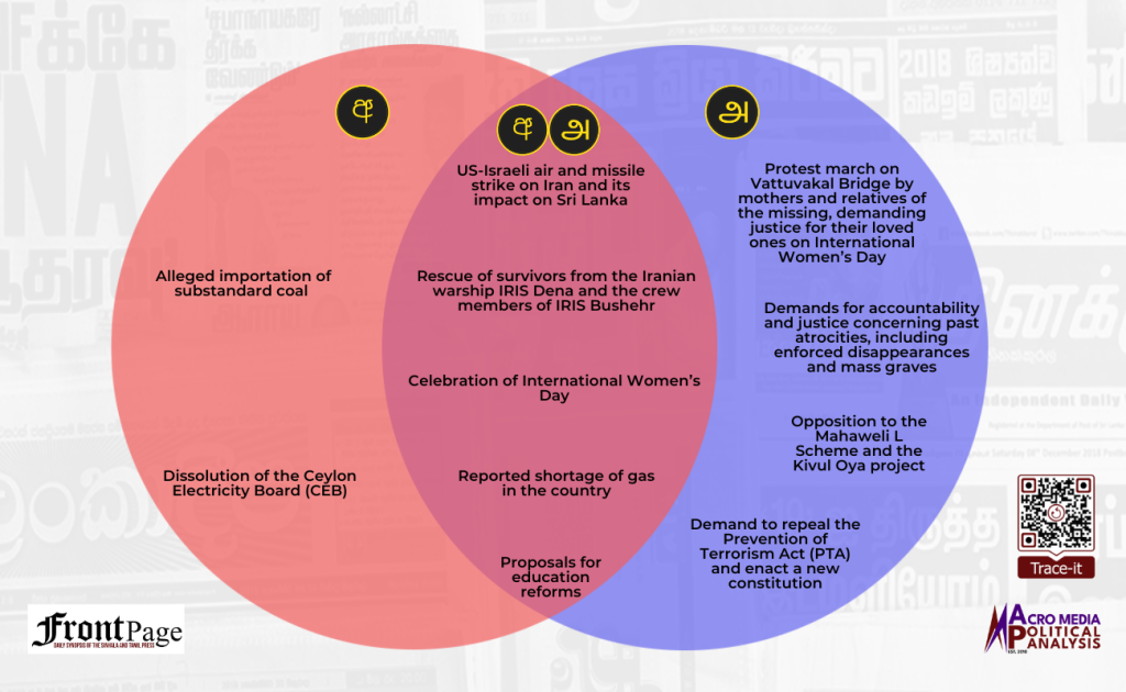 Over the past week the Sinhala and Tamil press converged in relation to five main stories. The five stories were on the: (i) US-Israeli air and missile strike on Iran and its impact on Sri Lanka; (ii) rescue of survivors from the Iranian warship IRIS Dena and the crew members of IRIS Bushehr; (iii) celebration of International Women’s Day; (iv) reported shortage of gas in the country; and (vii) proposals for education reforms.