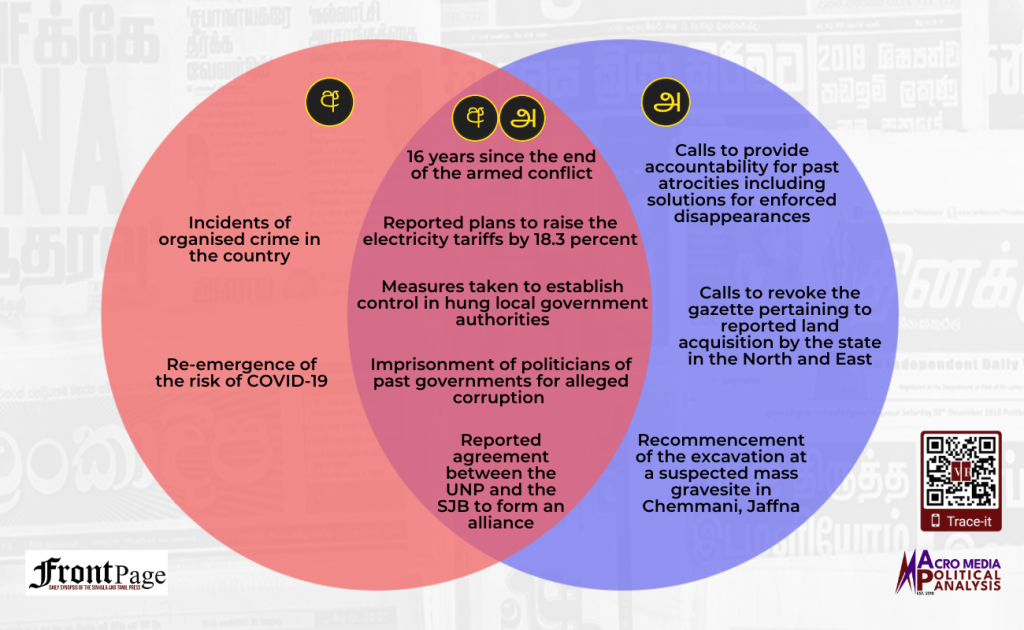 Over the past week the Sinhala and Tamil press converged in relation to six main stories. The six stories were on the: (i) 16 years since the end of the armed conflict; (ii) reported plans to raise the electricity tariffs by 18.3 percent; (iii) measures taken to establish control in hung local government authorities; (iv) imprisonment of politicians of past governments for alleged corruption; (v) reported agreement between the UNP and the SJB to form an alliance; and (vi) reported shortage of salt. The Sinhala press exclusively featured two main stories, and they were on the: (i) incidents of organised crime in the country and (ii) re-emergence of the risk of COVID-19. The Tamil press exclusively featured three main stories, and they were on the: (i) calls to provide accountability for past atrocities including solutions for enforced disappearances; (ii) calls to revoke the gazette pertaining to reported land acquisition by the state in the North and East; and (iii) recommencement of the excavation at a suspected mass gravesite in Chemmani, Jaffna.