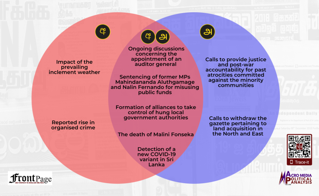 Over the past week the Sinhala and Tamil press converged in relation to five main stories. The five stories were on the: (i) ongoing discussions concerning the appointment of an auditor general; (ii) sentencing of former MPs Mahindananda Aluthgamage and Nalin Fernando for misusing public funds; (iii) formation of alliances to take control of hung local government authorities; (iv) the death of Malini Fonseka; and (v) detection of a new COVID-19 variant in Sri Lanka. The Sinhala press exclusively featured two main stories, and they were on the: (i) impact of the prevailing inclement weather and (ii) reported rise in organised crime. The Tamil press exclusively featured two main stories, and they were on the: (i) calls to provide justice and post-war accountability for past atrocities committed against the minority communities and (ii) calls to withdraw the gazette pertaining to land acquisition in the North and East.
