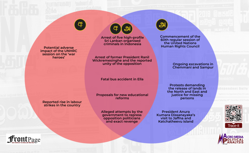 The Tamil press exclusively featured four main stories, and they were on the: (i) commencement of the 60th regular session of the United Nations Human Rights Council; (ii) ongoing excavations in Chemmani and Sampur; (iii) protests demanding the release of lands in the North and East and justice for missing persons; and (iv) President Anura Kumara Dissanayake’s visit to Jaffna and Katchatheevu island.