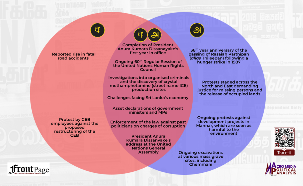 Over the past week the Sinhala and Tamil press converged in relation to seven main stories. The seven stories were on the: (i) completion of President Anura Kumara Dissanayake’s first year in office; (ii) ongoing 60th Regular Session of the United Nations Human Rights Council (UNHRC); (iii) investigations into organised criminals and the discovery of crystal methamphetamine (street name ICE) production sites; (iv) challenges facing Sri Lanka’s economy; (v) asset declarations of government ministers and MPs; (vi) enforcement of the law against past politicians on charges of corruption; and (vii) President Anura Kumara Dissanayake’s address at the United Nations General Assembly (UNGA).