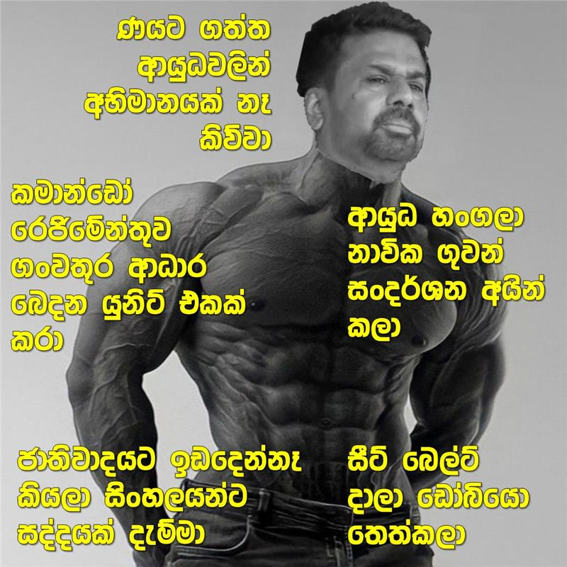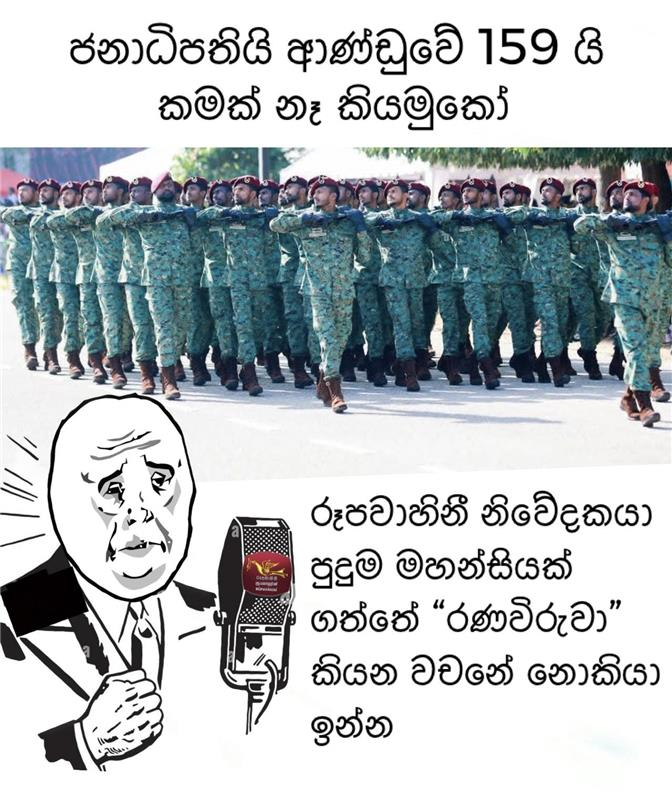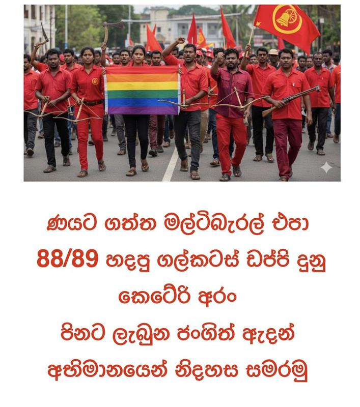 Context: The meme depicts a march by the JVP, and refers to the weapons allegedly used by the JVP during the 1988/89 insurgency. Additionally, leading up to the election in 2024, some NPP politicians stated during political meetings/programmes that they were wearing clothes loaned by friends, and that the economy of the country was so bad that it was not possible to afford even new underwear