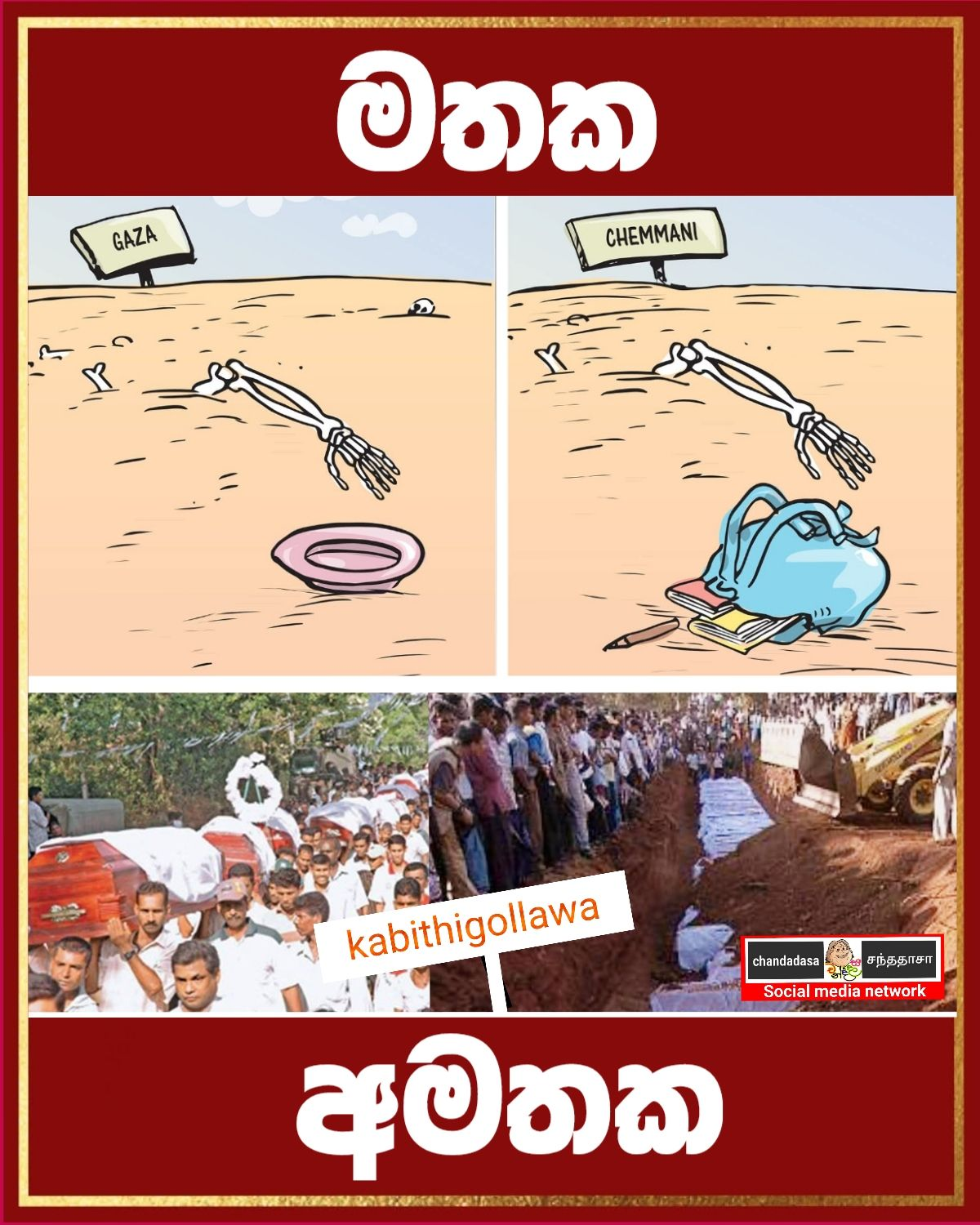Context: The bottom image refers to the Kebithigollewa massacre of 2006, where more than 63 Sinhala civilians were killed by landmines allegedly detonated by the LTTE.