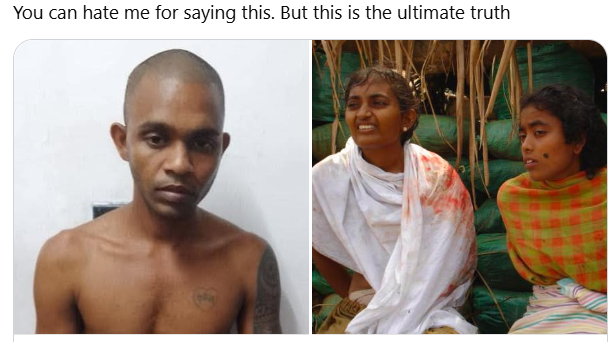 This meme juxtaposes an army deserter, arrested as a suspect in the alleged rape of a medical doctor in Anuradhapura, with a photograph of alleged war crimes committed by the armed forces in Mullivaikkal in 2009. A 2011 Channel 4 documentary, ‘Sri Lanka’s Killing Fields’, documented alleged war crimes including the rape and murder of Tamil women who had surrendered to the army.