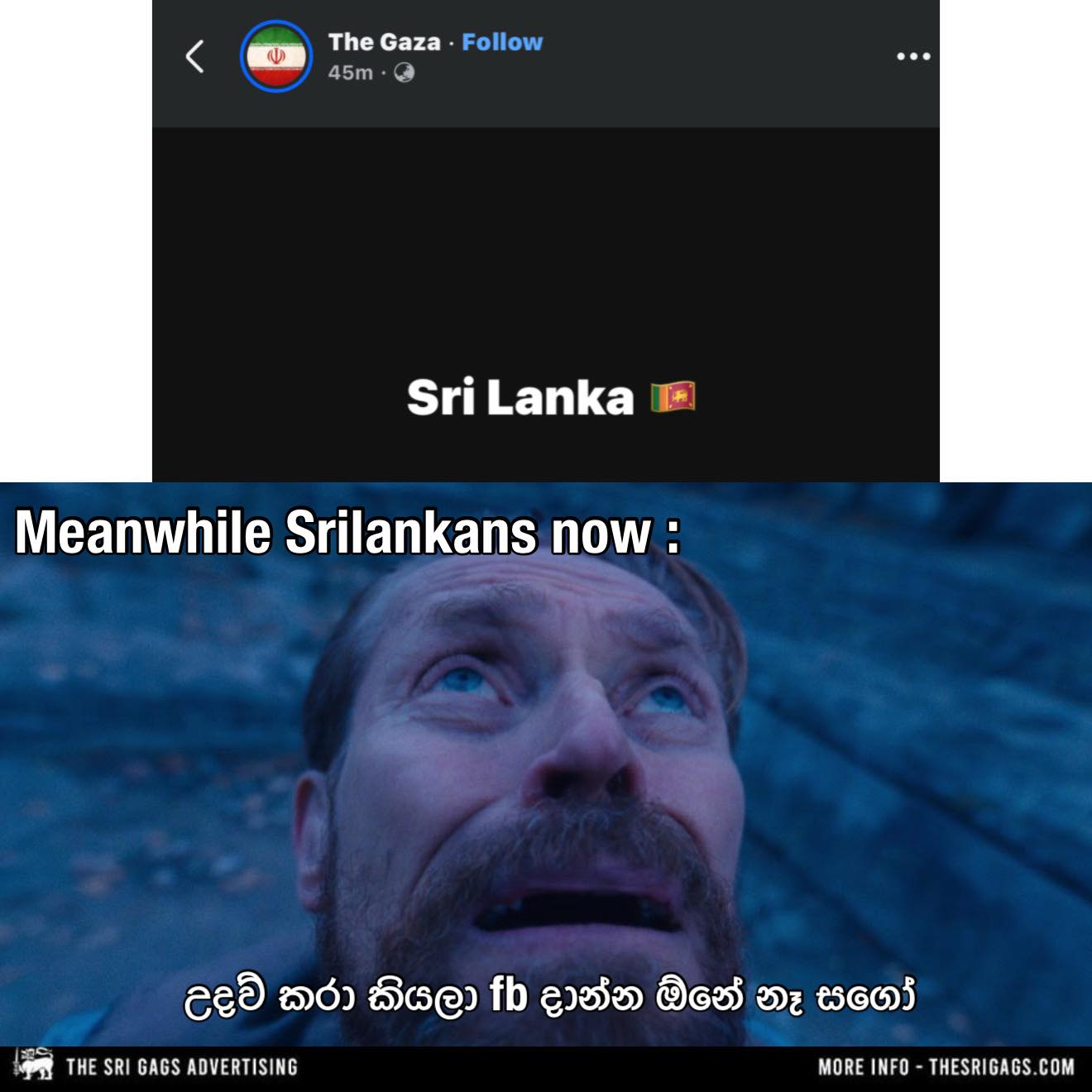 Context: An Iranian supporter (Facebook account, “The Gaza”) posted the words “Sri Lanka” on his account as a gesture of praise, following Sri Lanka’s rescue of sailors from the sunken Iranian vessel IRIS Dena. This prompted memes to be shared that, partly in jest, expressed alarm at Sri Lanka being associated with the incident.