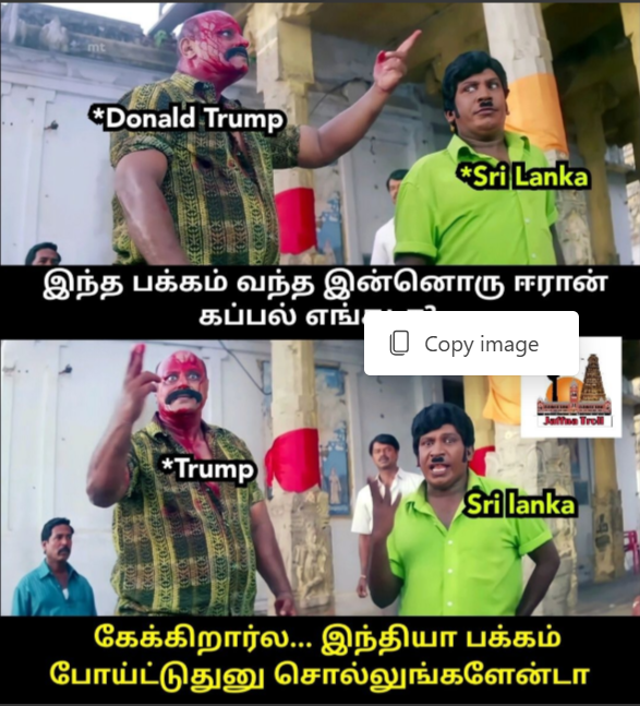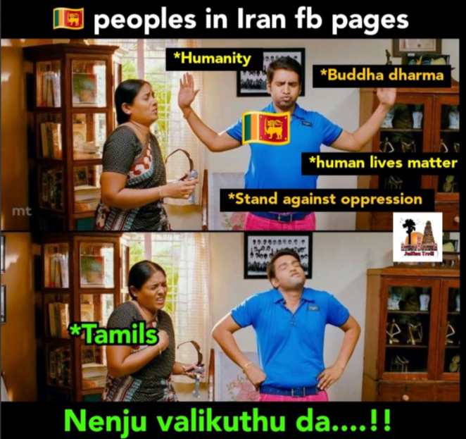 Context: This meme compares the public empathy expressed towards the rescue of the Iranian crew and contrasts it with the limited reported public empathy expressed towards the Tamils who were killed during the armed conflict.