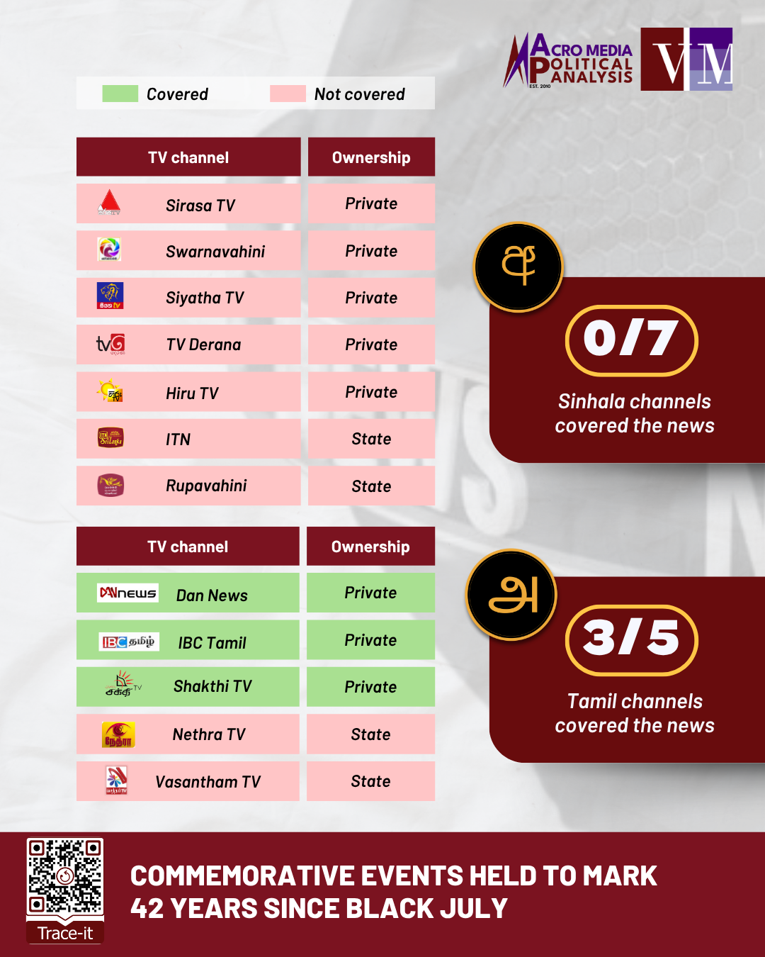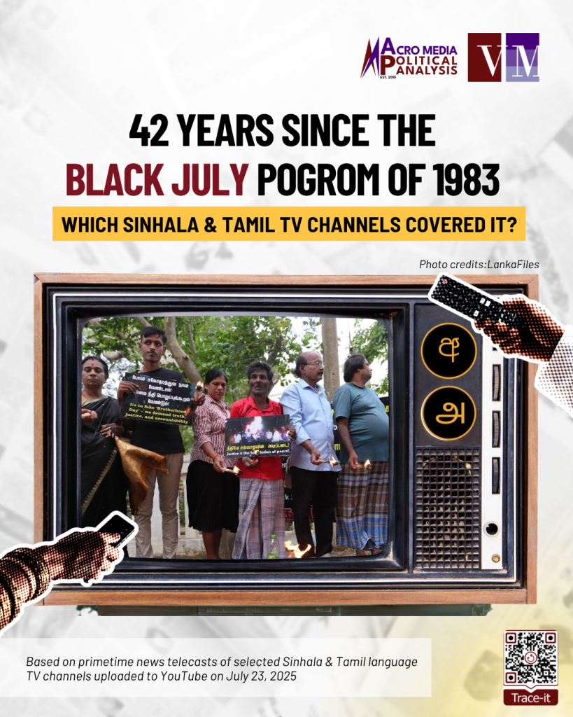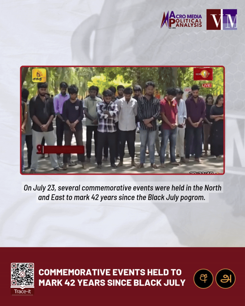 On July 23, several commemorative events were held in the North and East to mark 42 years since the Black July pogrom. Only privately-owned Tamil TV channels Dan News, IBC Tamil and Shakthi TV allotted coverage to the commemorative events in their primetime news telecasts.