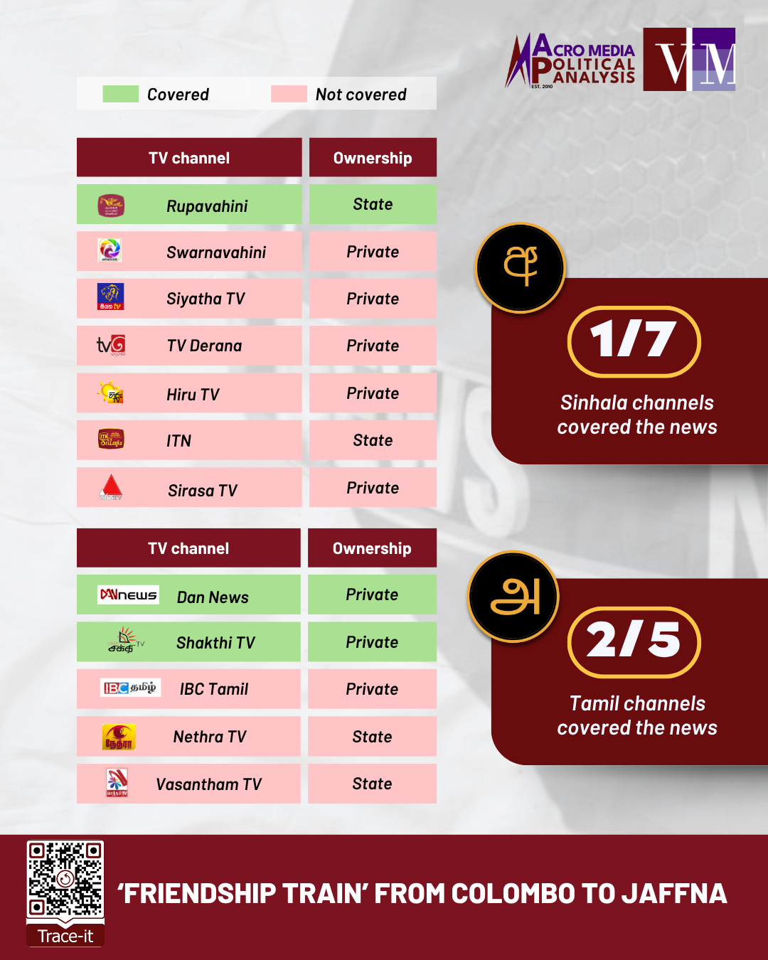 On the same day, the Socialist Youth Society facilitated a train between Colombo and Jaffna to mark Black July, named the ‘Friendship Train’. Only privately-owned Tamil TV channels Dan News and Shakthi TV, and state-owned Sinhala TV channel Rupavahini afforded coverage to the ‘Friendship Train’ in their primetime news telecasts.