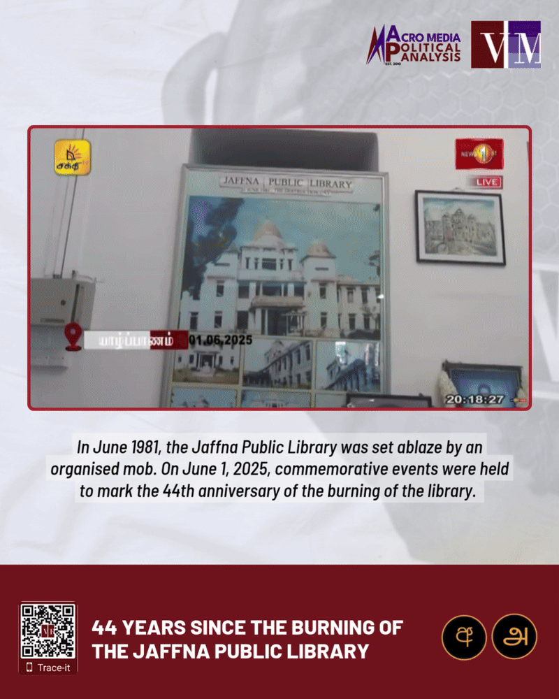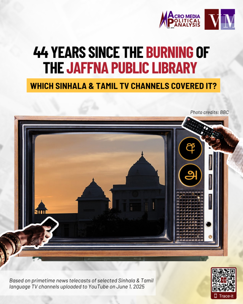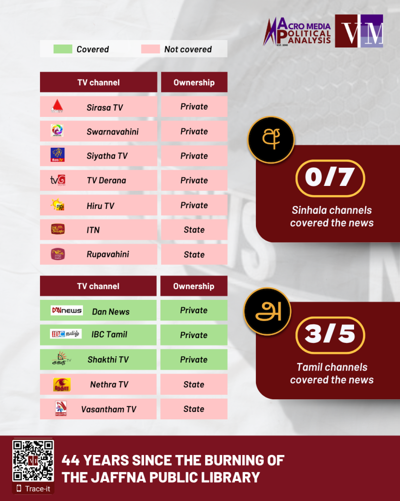 In June 1981, the Jaffna Public Library was set ablaze by an organised mob. On June 1, 2025, commemorative events were held to mark the 44th anniversary of the burning of the library. Privately-owned Tamil TV channels Dan News, IBC Tamil and Shakthi TV afforded coverage to the commemorative events. By contrast, no coverage was afforded to the events by state-owned Tamil TV channels Nethra TV and Vasantham TV, as well as by the Sinhala TV channels, privately-owned Sirasa TV, Swarnavahini, Siyatha TV, TV Derana and Hiru TV and state-owned ITN and Rupavahini.