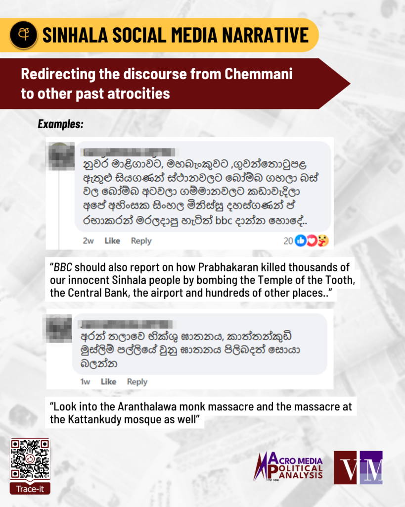 The Sinhala and Tamil social media spaces presented two distinct narratives regarding the Chemmani mass grave. The Sinhala social media commentary tended to redirect the discourse from Chemmani to other past atrocities, including those committed by the LTTE in Aranthalawa, Eravur and Kebithigollewa. By contrast, the Tamil social media commentary demanded justice and directed blame towards the state and the military.