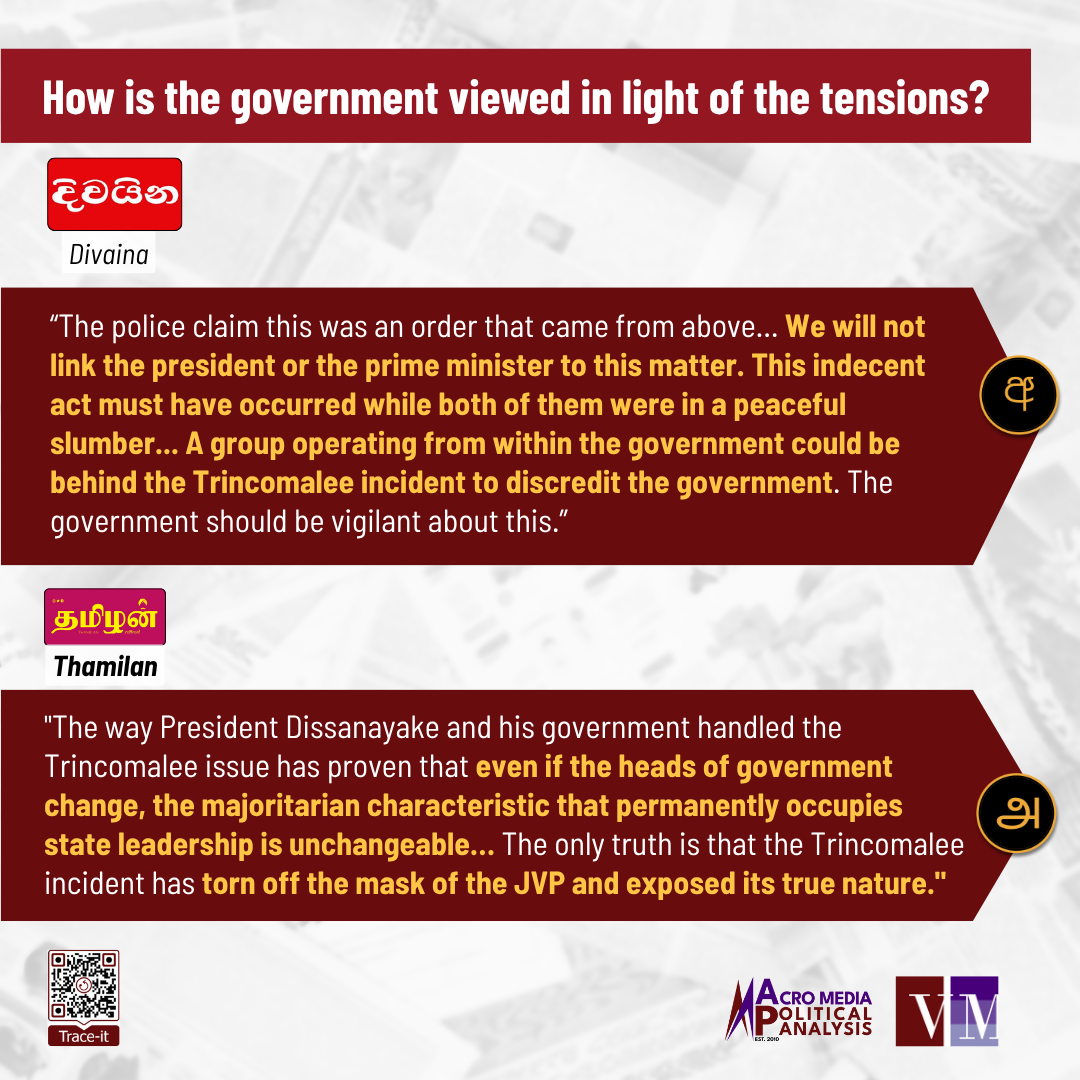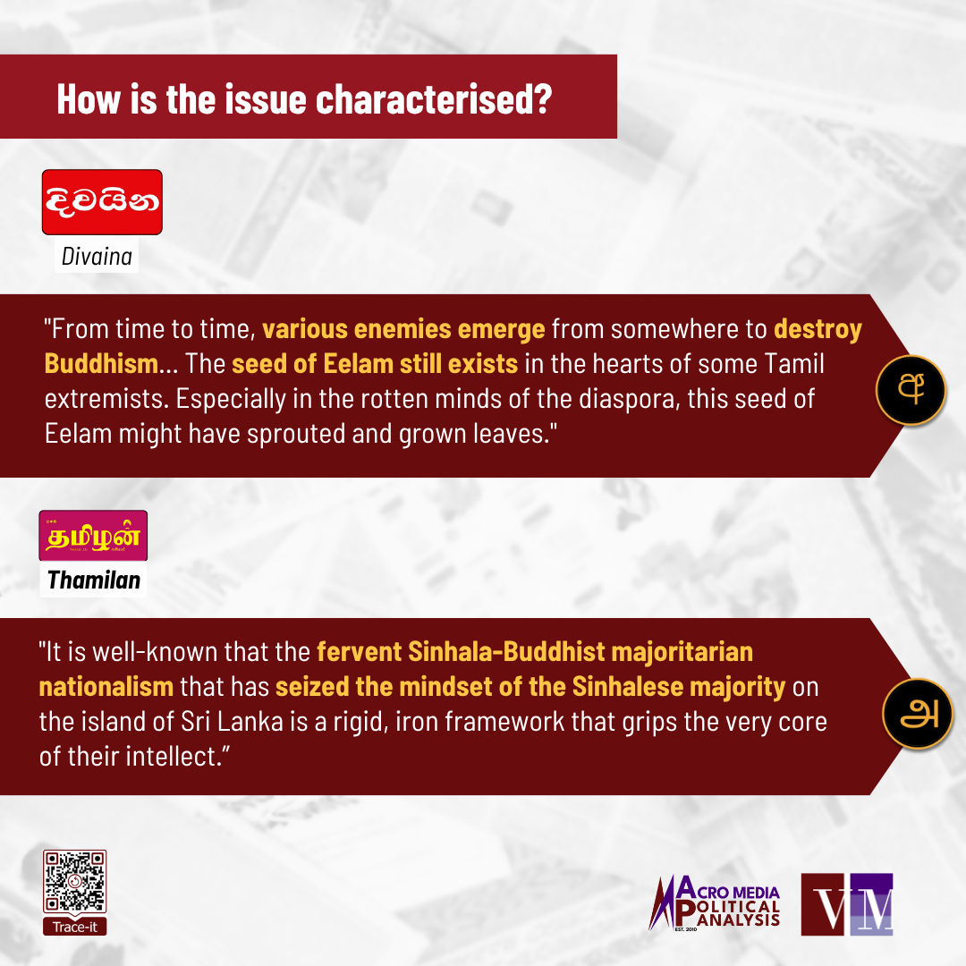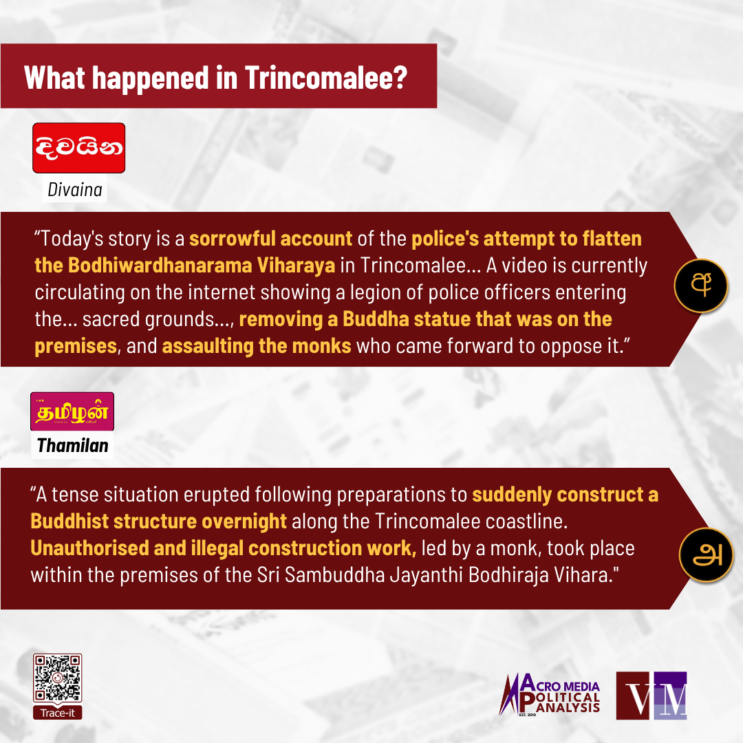 On November 18, newspapers reported on a tense situation in Trincomalee, over the reported installation of a Buddha statue. Editorials in the privately-owned Sinhala newspaper Divaina and the privately-owned Tamil newspaper Thamilan presented clashing narratives on the incident.