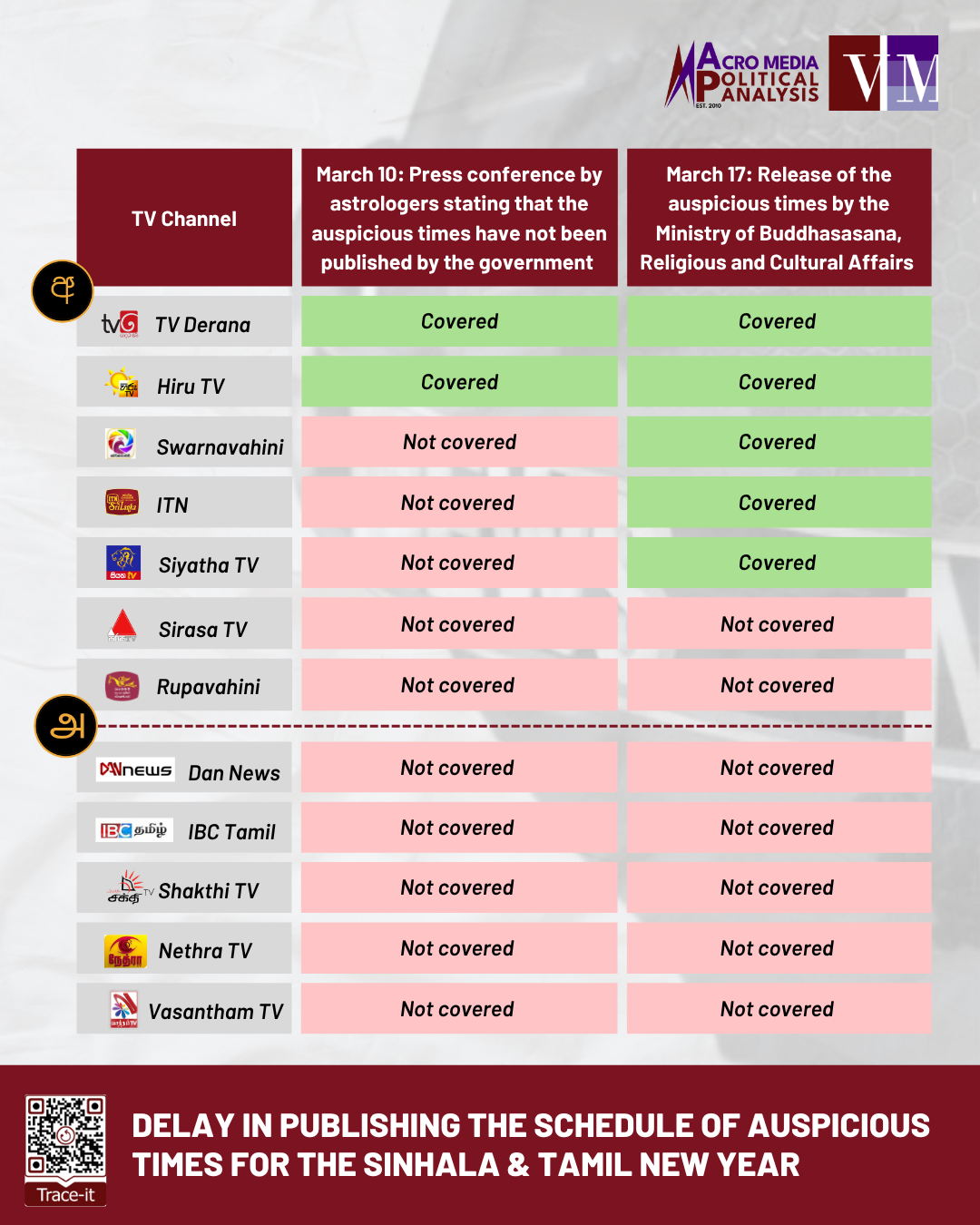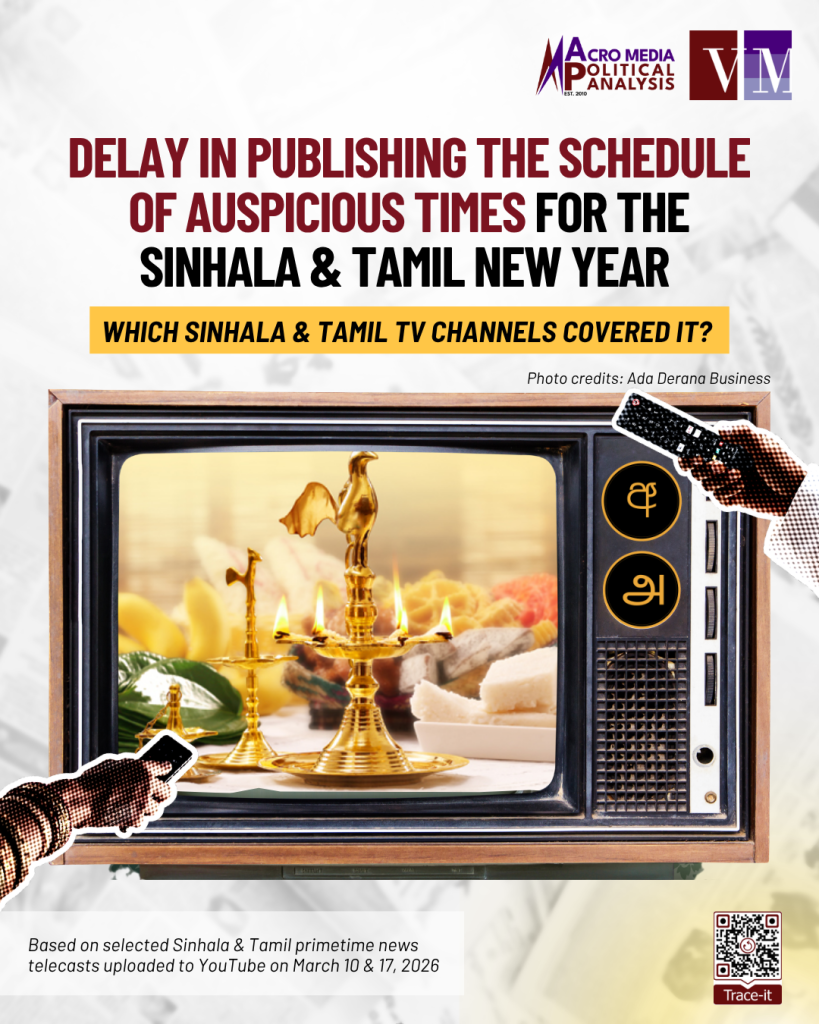 On March 10, a group of astrologers held a media briefing during which they alleged that the government had announced that it would not publish a schedule of auspicious times for the Sinhala and Tamil New Year. On March 17, the Ministry of Buddhasasana, Religious and Cultural Affairs announced the publication of the schedule. Which Sinhala and Tamil TV channels covered the two events?