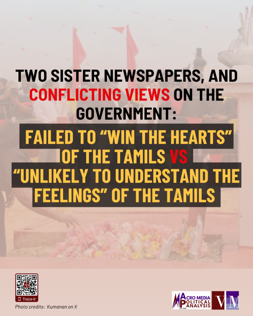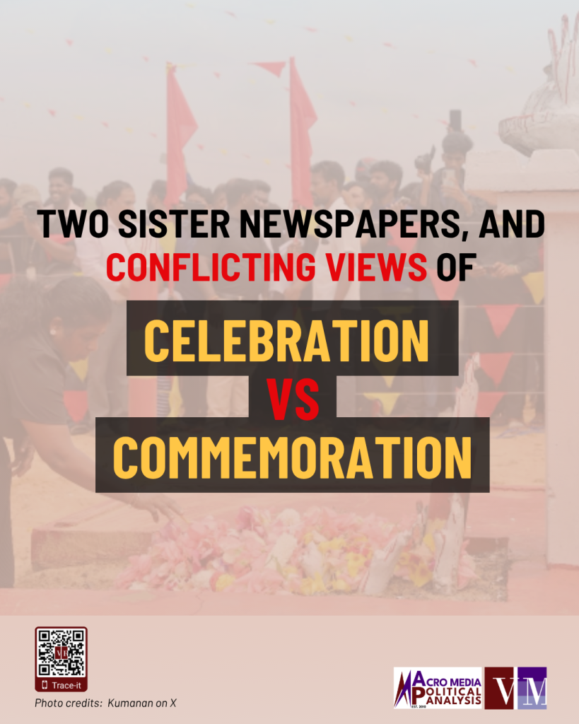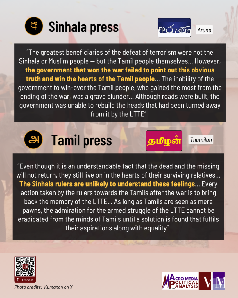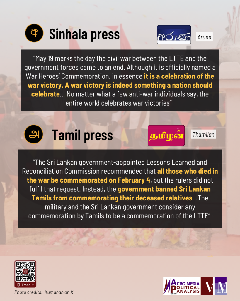 May 18, 2025 marked 16 years since the end of the armed conflict in Sri Lanka. Two sister newspapers, privately-owned Sinhala newspaper Aruna and privately-owned Tamil newspaper Thamilan, featured conflicting views on the anniversary. Aruna viewed the war heroes’ commemoration as a “celebration” of the war victory. By contrast, Thamilan viewed the anniversary as a day on which relatives deceased during the war are “commemorated”.
