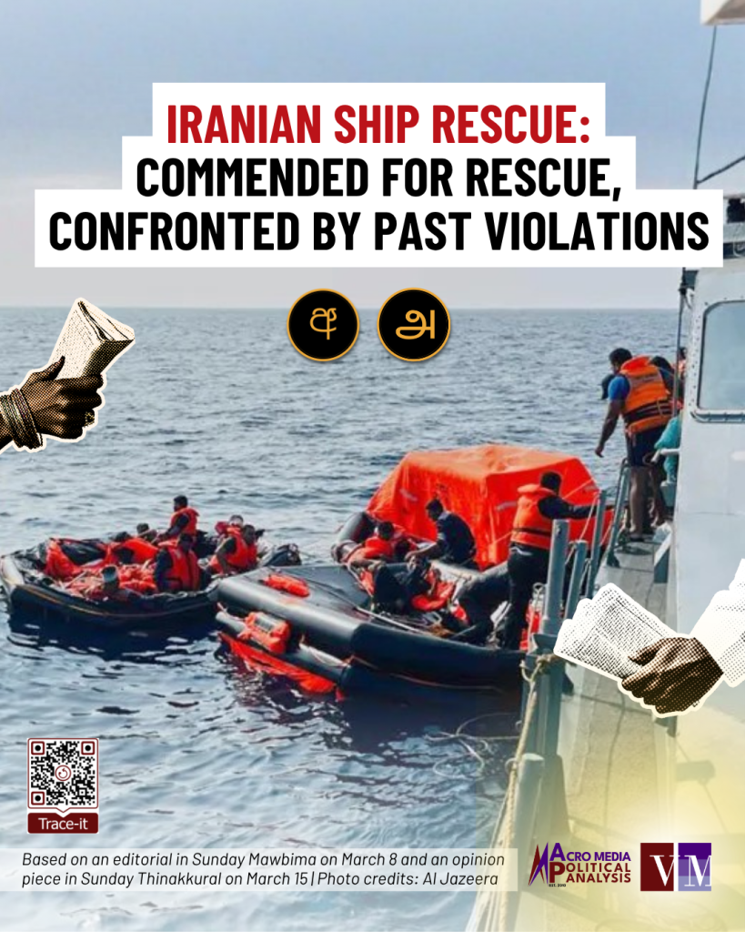 Commenting on the rescue of the crew of the Iranian ship IRIS Dena, Sunday Mawbima viewed it as a “humanitarian” act. By contrast, Sunday Thinakkural found the narrative of humanitarianism “ironic” in the light of alleged human rights violations reportedly committed during the final stages of Sri Lanka’s armed conflict.