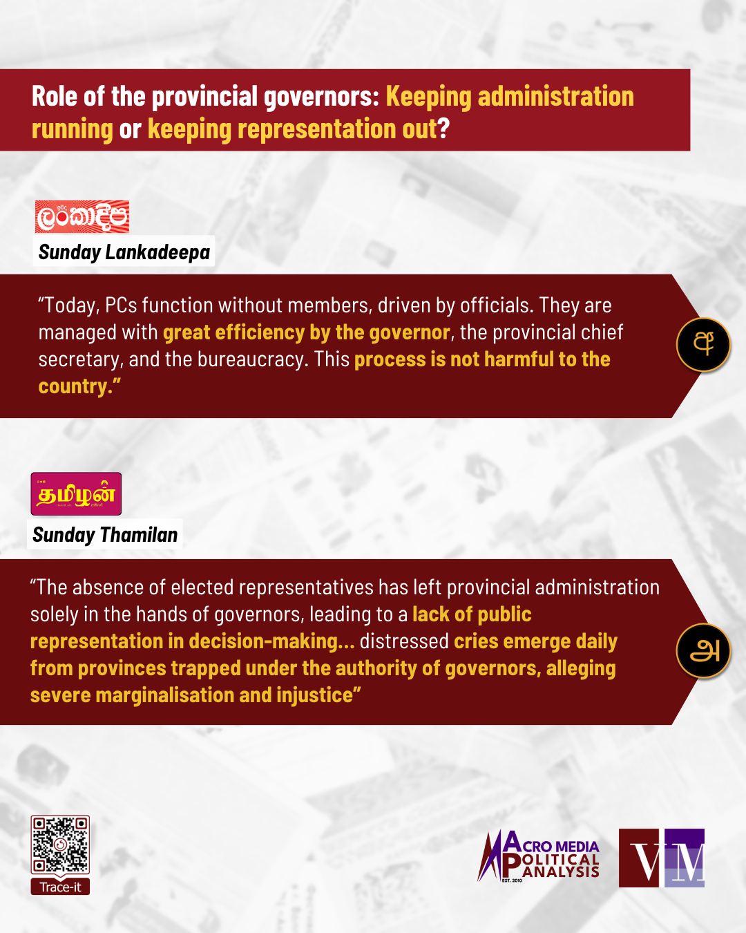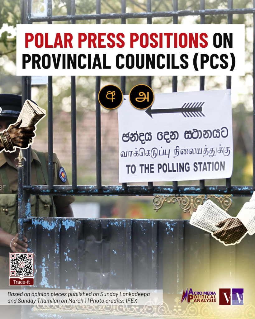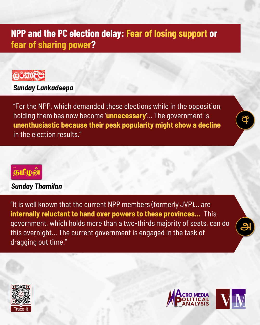 Discussing the Provincial Council elections, privately-owned newspapers Sunday Lankadeepa and Sunday Thamilan featured polarised positions on the NPP’s delay on holding the elections, and the role of provincial governors.