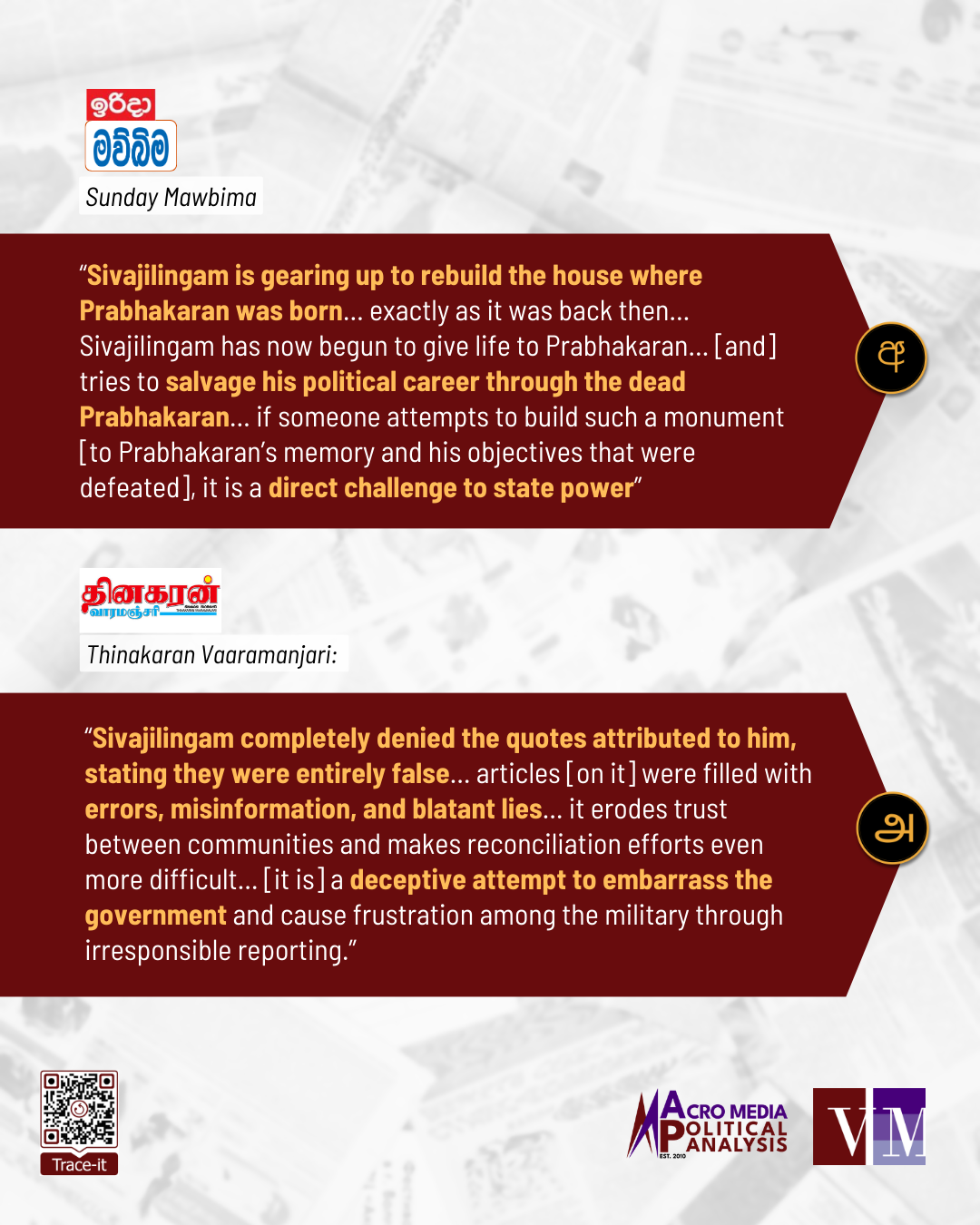 Privately-owned Sunday Mawbima and Thinakaran Varamanjari recently discussed the proposal to renovate former LTTE Leader Prabhakaran’s house in Valvettithurai, Jaffna. Sunday Mawbima criticised Valvettithurai UC Member Sivajilingam’s proposal to make use of the house as a monument, while Thinakaran Varamanjari criticised alleged attempts to misquote Sivajilingam regarding the renovation.