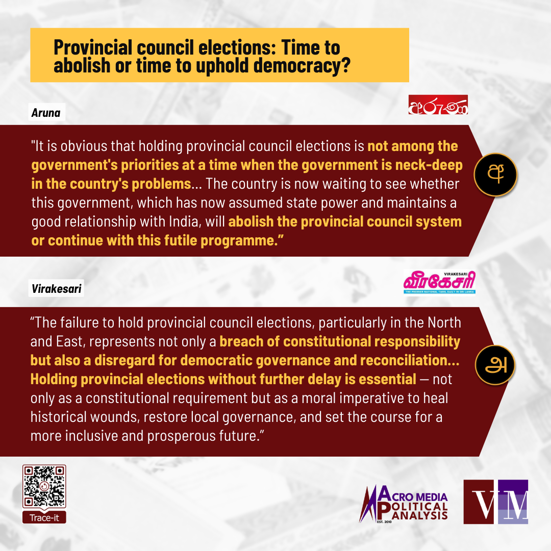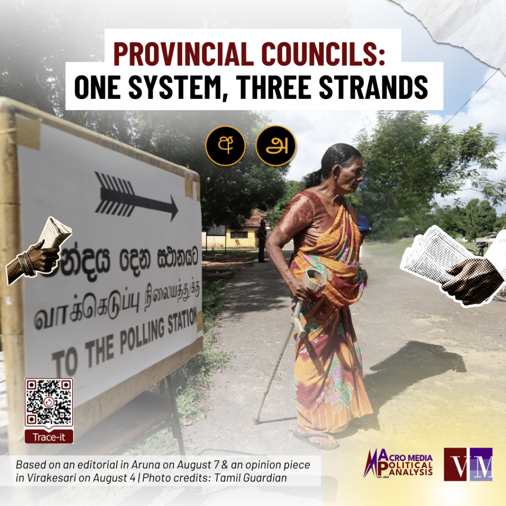 The privately-owned Sinhala newspaper Aruna and the privately-owned Tamil newspaper Virakesari recently featured an editorial and an opinion piece on provincial councils. Their views on provincial councils contrasted along three main strands of discussion: 1) whether the Indo-Sri Lanka Accord was imposed or inevitable; 2) whether the provincial councils are an economic burden or a democratic gain; and 3) whether it’s time to abolish provincial council elections or uphold democracy.