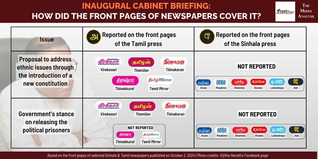 On October 1, Cabinet Spokesperson Vijitha Herath hosted the new government’s inaugural media briefing. Some of the points raised by Herath included proposals to address ongoing ethnic issues through the introduction of a new constitution and the government’s stance on releasing political prisoners. A majority of the Tamil newspapers covered the above two topics. By contrast, none of the Sinhala newspapers covered the two topics.